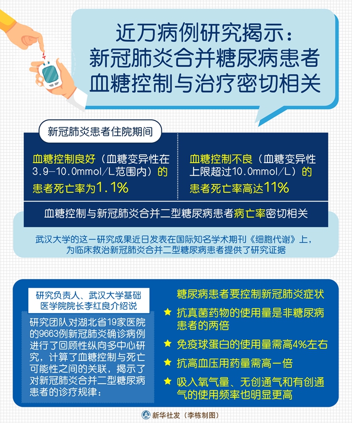 新華社武漢5月4日電(記者 王賢)新冠肺炎患者住院期間,血糖控制良好(血糖變異性在3.9-10.0mmol/L范圍內(nèi))的患者死亡率為1.1%,血糖控制不良(血糖變異性上限超過10.0mmol/L)的患者死亡率高達11%,血糖控制與新冠肺炎合并二型糖尿病患者病亡率密切相關(guān)。武漢大學(xué)的這一研究成果近日發(fā)表在國際知名學(xué)術(shù)期刊《細胞代謝》上,為臨床救治新冠肺炎合并二型糖尿病患者提供了研究證據(jù)。