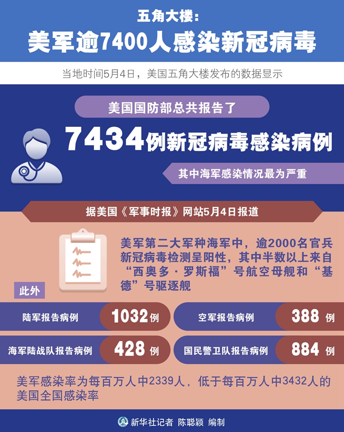 新華社華盛頓5月4日電(記者徐劍梅 鄧仙來)美國五角大樓4日發(fā)布的數(shù)據(jù)顯示,截至目前,美國國防部總共報告了7434例新冠病毒感染病例,其中海軍感染情況最為嚴重。