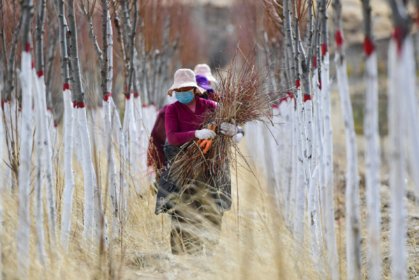 當(dāng)?shù)厝罕娫谟駱涓咴М€林木良種繁育實驗基地清理樹枝 張龍 攝