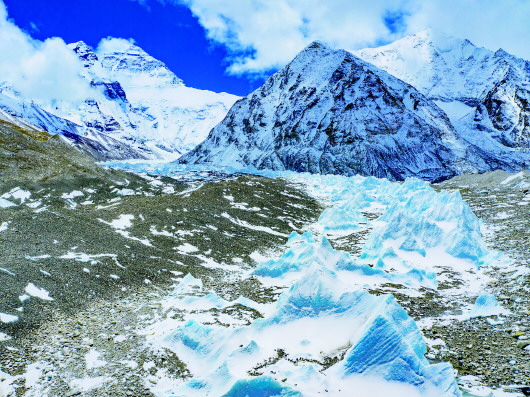 位于珠穆朗瑪峰腳下海拔5400米左右的中絨布冰川(4月30日攝,無(wú)人機(jī)照片)。普布扎西攝