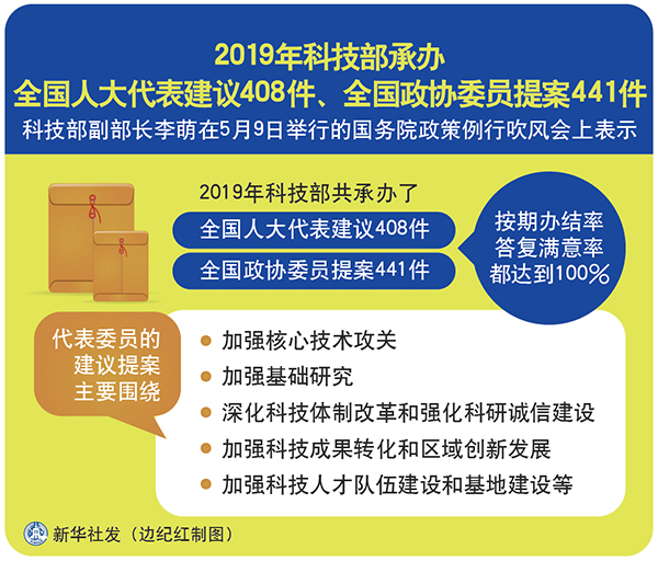 新華社北京5月9日電(記者張泉、董瑞豐)科技部副部長(zhǎng)李萌在9日舉行的國(guó)務(wù)院政策例行吹風(fēng)會(huì)上表示,去年科技部共承辦了全國(guó)人大代表建議408件、全國(guó)政協(xié)委員提案441件,按期辦結(jié)率和答復(fù)滿意率都達(dá)到100%。