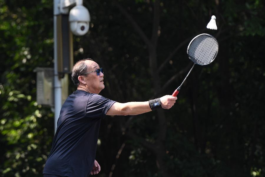 5月3日,一位市民在合肥市環(huán)城公園內(nèi)打羽毛球。 當日是“五一”假期第三天,合肥市民紛紛來到戶外,健身休閑,樂享假期。 新華社記者 張端 攝