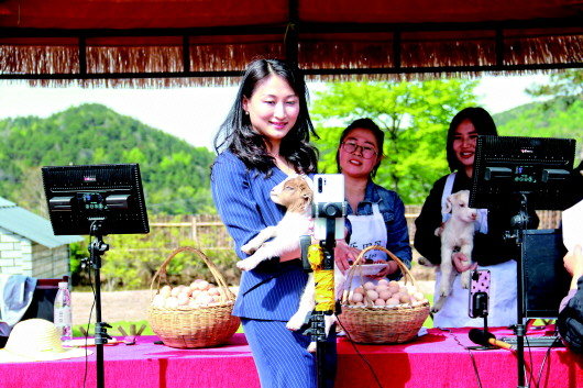 4月7日,在安徽香茗山的喜樂(lè)田園農(nóng)場(chǎng),太湖縣副縣長(zhǎng)唐翔與網(wǎng)友互動(dòng)。 受訪(fǎng)者供圖