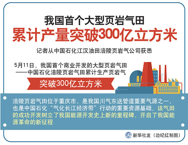 新華社重慶5月11日電(記者陶冶)記者從中國石化江漢油田涪陵頁巖氣公司獲悉,5月11日,我國首個(gè)商業(yè)開發(fā)的大型頁巖氣田——中國石化涪陵頁巖氣田累計(jì)生產(chǎn)頁巖氣突破300億立方米。