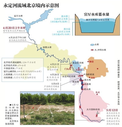 4月20日8時,官廳水庫開閘放水,截至5月12日15時18分,官廳水庫水位已由476.58米(蓄水量5.69億立方米)降至475.19米(蓄水量4.25億立方米),累計(jì)出庫超1.4億立方米。