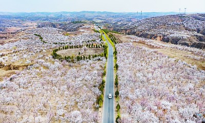 近日,在陜西省榆林市榆陽區(qū)南部山區(qū),漫山遍野杏花盛開,黃土高坡生機勃勃。新華社發(fā)