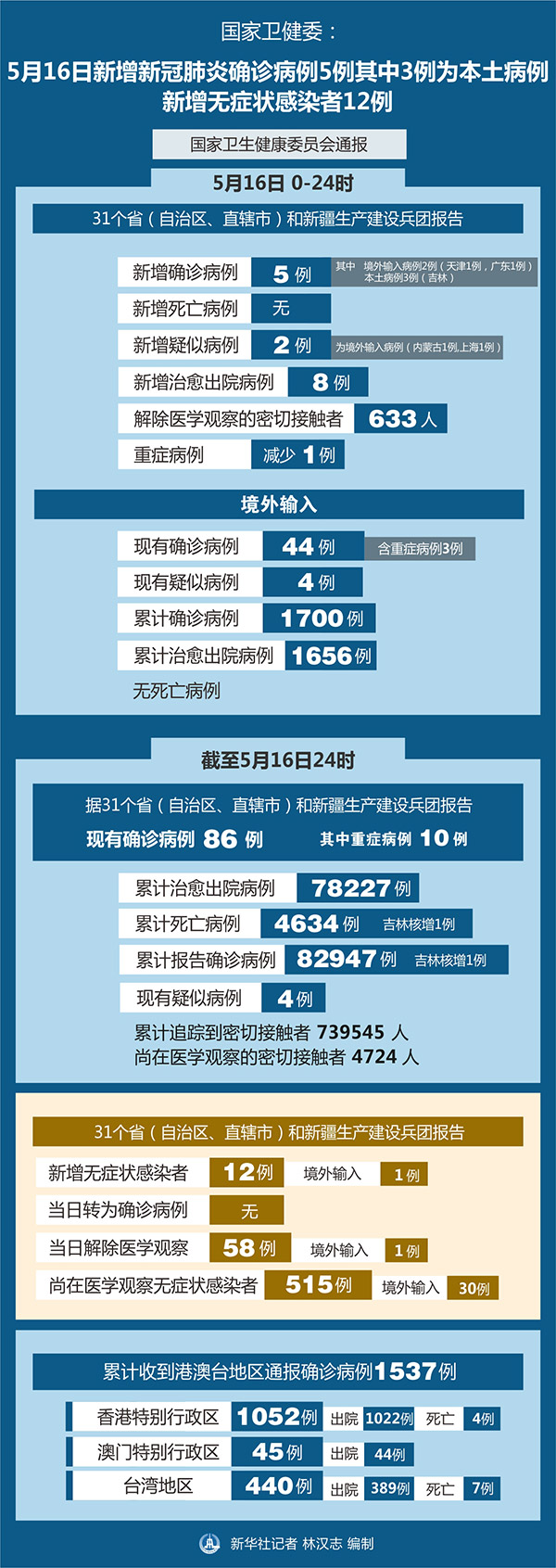 截至5月16日24時,據31個省(自治區(qū)、直轄市)和新疆生產建設兵團報告,現有確診病例86例(其中重癥病例10例),累計治愈出院病例78227例,累計死亡病例4634例(吉林核增1例),累計報告確診病例82947例(吉林核增1例),現有疑似病例4例。累計追蹤到密切接觸者739545人,尚在醫(yī)學觀察的密切接觸者4724人。