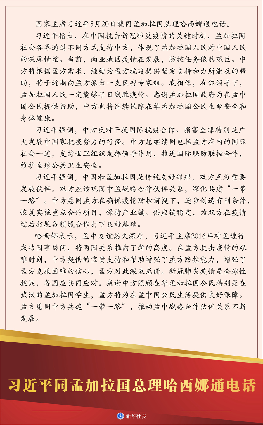新華社北京5月20日電 國家主席習(xí)近平5月20日晚同孟加拉國總理哈西娜通電話。