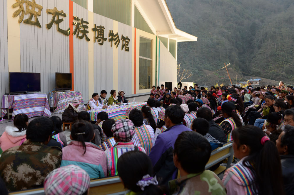 受到習(xí)近平總書記會(huì)見的貢山縣干部群眾代表回到獨(dú)龍江鄉(xiāng),在新修起的獨(dú)龍族博物館前用漢語和獨(dú)龍語向數(shù)百名獨(dú)龍族群眾宣講總書記的講話內(nèi)容(2015年1月22日攝)。新華社記者 胡超 攝