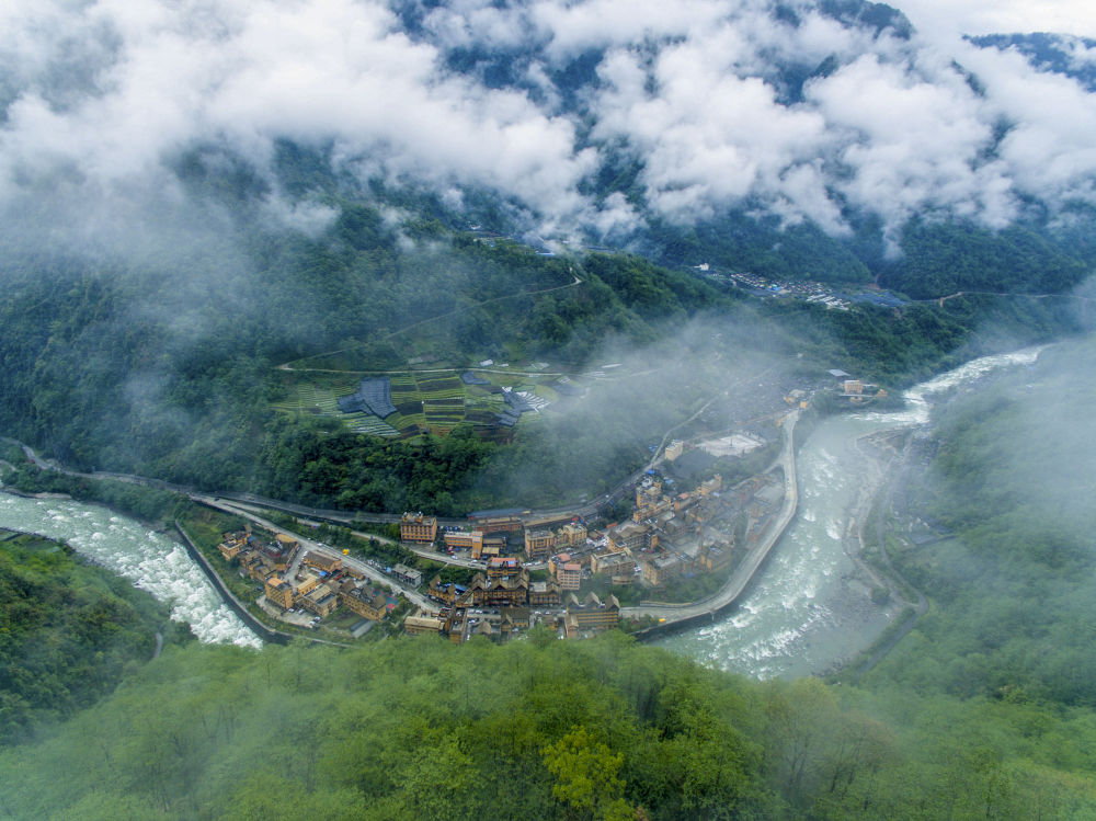 云霧繚繞的云南貢山獨(dú)龍族怒族自治縣獨(dú)龍江鄉(xiāng)(2019年4月16日無人機(jī)拍攝)。新華社記者 江文耀 攝