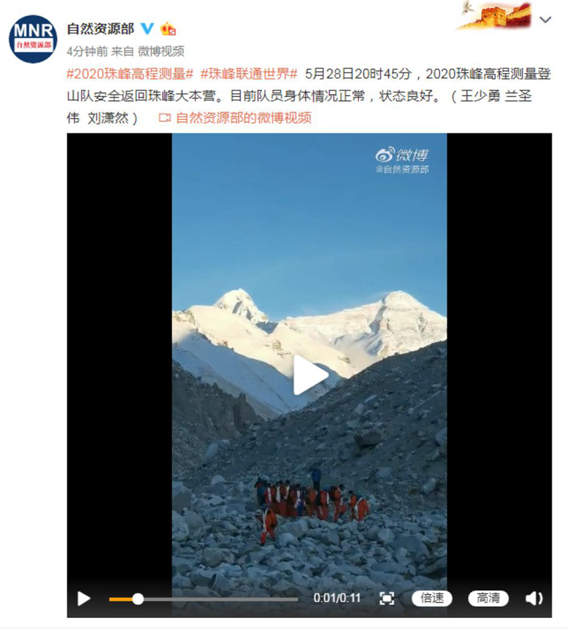 5月28日20時45分,2020珠峰高程測量登山隊安全返回珠峰大本營。目前隊員身體情況正常,狀態(tài)良好。(王少勇 蘭圣偉 劉瀟然)