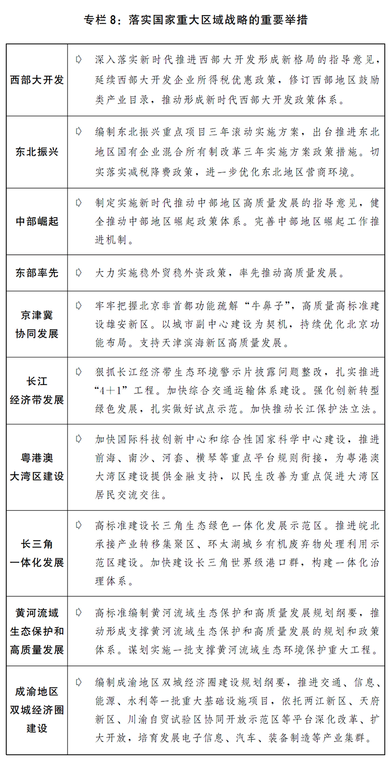 一是落實(shí)落細(xì)重大區(qū)域發(fā)展戰(zhàn)略。落實(shí)區(qū)域協(xié)調(diào)發(fā)展新機(jī)制,持續(xù)推進(jìn)西部大開發(fā)形成新格局,支持東北地區(qū)全面振興全方位振興,健全中部地區(qū)崛起政策體系和工作機(jī)制,繼續(xù)推動(dòng)?xùn)|部地區(qū)率先發(fā)展??v深推進(jìn)京津冀協(xié)同發(fā)展,加快實(shí)施雄安新區(qū)重點(diǎn)建設(shè)項(xiàng)目,完善北京非首都功能疏解政策體系。大力推進(jìn)長江經(jīng)濟(jì)帶生態(tài)環(huán)境突出問題整改和系統(tǒng)性保護(hù)修復(fù),加快構(gòu)建綜合交通運(yùn)輸體系,促進(jìn)內(nèi)河船舶改造。推動(dòng)粵港澳大灣區(qū)基礎(chǔ)設(shè)施互聯(lián)互通,有序開展國際科技創(chuàng)新中心建設(shè),加快橫琴、河套等重大合作平臺(tái)建設(shè)。高標(biāo)準(zhǔn)建設(shè)長三角生態(tài)綠色一體化示范區(qū),推動(dòng)長三角交通一體化更高質(zhì)量發(fā)展,建設(shè)虹橋國際開放樞紐。抓緊做好黃河流域生態(tài)保護(hù)和高質(zhì)量發(fā)展規(guī)劃綱要編制和出臺(tái)實(shí)施工作。大力支持成渝地區(qū)雙城經(jīng)濟(jì)圈建設(shè),打造全國高質(zhì)量發(fā)展的重要增長極。積極推進(jìn)西部陸海新通道建設(shè)。深化對口支援。支持少數(shù)民族和民族地區(qū)加快發(fā)展。推動(dòng)國家級(jí)新區(qū)、開發(fā)區(qū)等功能平臺(tái)創(chuàng)新提升發(fā)展,加快推進(jìn)資源型地區(qū)經(jīng)濟(jì)轉(zhuǎn)型和老工業(yè)城市更新改造。推動(dòng)山西開展能源革命綜合改革試點(diǎn)。繼續(xù)推進(jìn)承接產(chǎn)業(yè)轉(zhuǎn)移示范區(qū)建設(shè),在具備條件的內(nèi)陸城市打造一批高端制造業(yè)基地。制定發(fā)展海洋經(jīng)濟(jì)加快建設(shè)海洋強(qiáng)國的意見。完善主體功能區(qū)戰(zhàn)略和制度,編制《全國國土空間規(guī)劃綱要(2021-2035)》。
