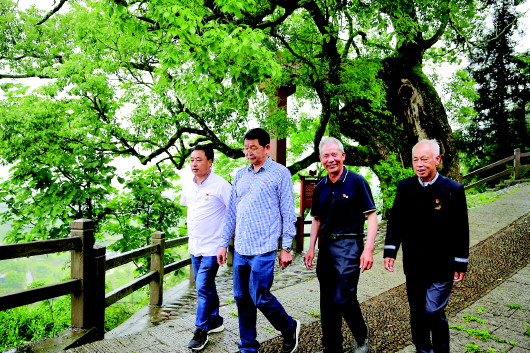 5月21日,金坵村的四位村書(shū)記蘭文忠(現(xiàn)任)、潘欣根、陳立平、雷正余(從左至右)走在村里的小路上。記者崔力攝