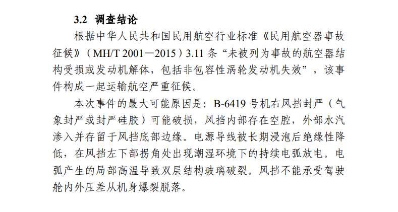 調(diào)查報(bào)告顯示,本次事件的最大可能原因是:B-6419號(hào)機(jī)右風(fēng)擋封嚴(yán)(氣象封嚴(yán)或封嚴(yán)硅膠)可能破損,風(fēng)擋內(nèi)部存在空腔,外部水汽滲入并存留于風(fēng)擋底部邊緣。電源導(dǎo)線被長(zhǎng)期浸泡后絕緣性降低,在風(fēng)擋左下部拐角處出現(xiàn)潮濕環(huán)境下的持續(xù)電弧放電。電弧產(chǎn)生的局部高溫導(dǎo)致雙層結(jié)構(gòu)玻璃破裂。風(fēng)擋不能承受駕駛艙內(nèi)外壓差從機(jī)身爆裂脫落。