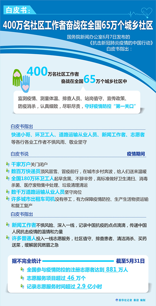 白皮書指出,新聞工作者不懼風險、深入一線,記錄中國抗疫的點點滴滴,傳遞中國人民抗擊疫情的溫情和力量。許多普通人投入一線志愿服務(wù),社區(qū)值守、排查患者、清潔消殺、買藥送菜,緩解居民燃眉之急。據(jù)不完全統(tǒng)計,截至5月31日,全國參與疫情防控的注冊志愿者達到881萬人,志愿服務(wù)項目超過46萬個,記錄志愿服務(wù)時間超過2.9億小時。