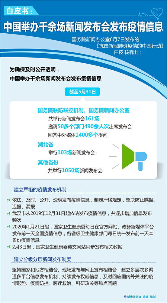 截至5月31日,國(guó)務(wù)院聯(lián)防聯(lián)控機(jī)制、國(guó)務(wù)院新聞辦公室共舉行新聞發(fā)布會(huì)161場(chǎng),邀請(qǐng)50多個(gè)部門490余人次出席發(fā)布會(huì),回答中外媒體1400多個(gè)提問;湖北省舉行103場(chǎng)新聞發(fā)布會(huì),其他省份共舉行1050場(chǎng)新聞發(fā)布會(huì)。