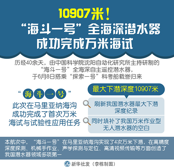 “海斗一號(hào)”此次在馬里亞納海溝成功完成了首次萬米海試與試驗(yàn)性應(yīng)用任務(wù),最大下潛深度10907米,刷新我國(guó)潛水器最大下潛深度紀(jì)錄,同時(shí)填補(bǔ)了我國(guó)萬米作業(yè)型無人潛水器的空白。
