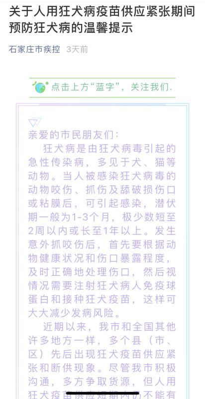 6月6日,石家莊市疾控中心發(fā)布了公告稱(chēng)狂犬疫苗供應(yīng)緊張。截圖