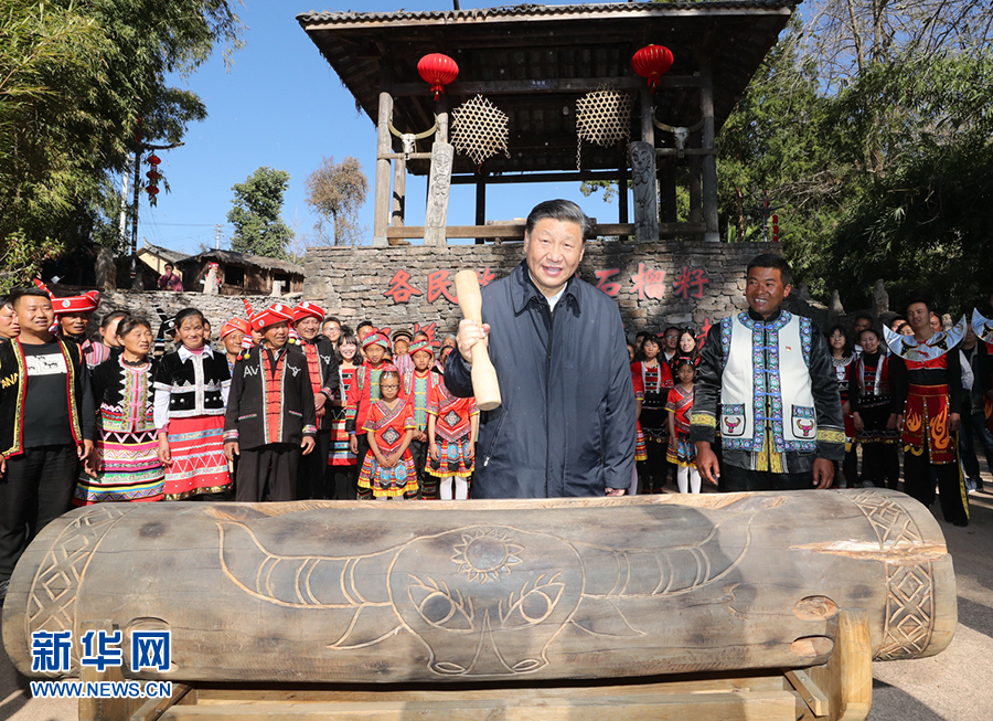今年1月19日,正在云南考察的習(xí)近平來到騰沖市清水鄉(xiāng)三家村中寨司莫拉佤族村。司莫拉,佤語意為“幸福的地方”。習(xí)近平說,在大家努力下,你們這里已經(jīng)實(shí)現(xiàn)脫貧并正向新的發(fā)展目標(biāo)努力邁進(jìn),可喜可賀。全面建成小康社會之后要全面推進(jìn)鄉(xiāng)村振興,讓幸福的佤族村更加幸福!按照當(dāng)?shù)亓?xí)俗,習(xí)近平拿起鼓棒,敲響三聲木鼓,祝福風(fēng)調(diào)雨順、國泰民安、四海升平,并向鄉(xiāng)親們致以新春祝福。