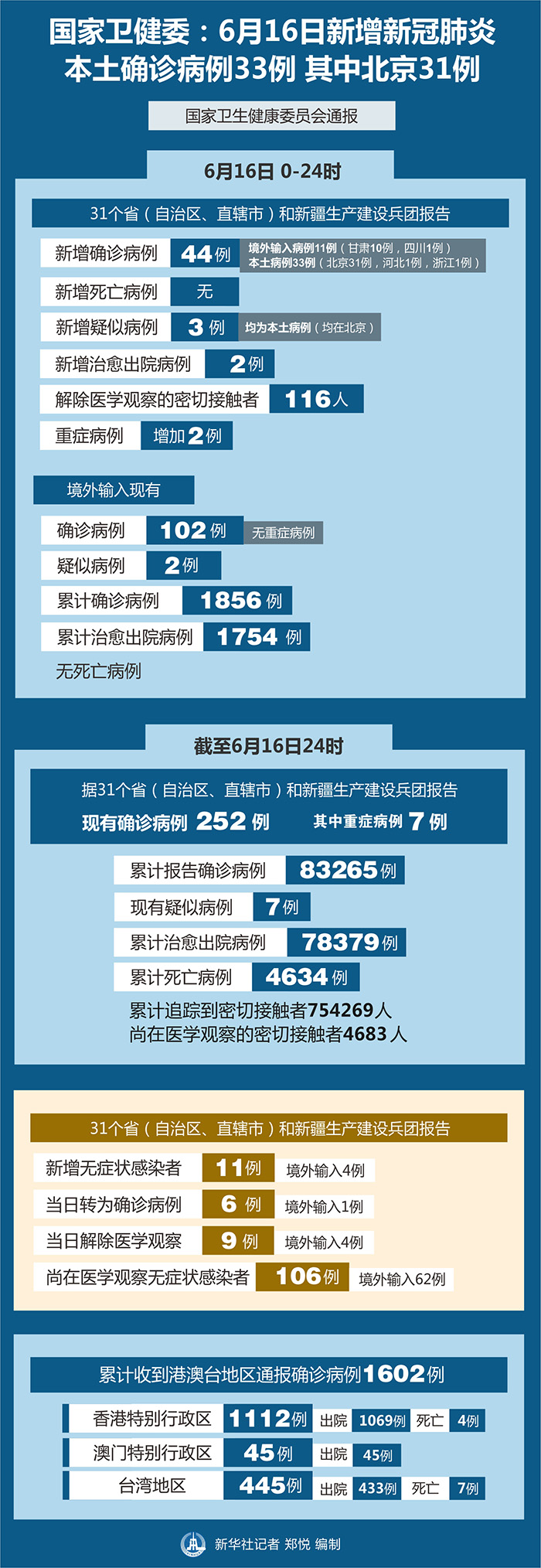 截至6月16日24時(shí),據(jù)31個(gè)省(自治區(qū)、直轄市)和新疆生產(chǎn)建設(shè)兵團(tuán)報(bào)告,現(xiàn)有確診病例252例(其中重癥病例7例),累計(jì)治愈出院病例78379例,累計(jì)死亡病例4634例,累計(jì)報(bào)告確診病例83265例,現(xiàn)有疑似病例7例。累計(jì)追蹤到密切接觸者754269人,尚在醫(yī)學(xué)觀察的密切接觸者4683人。