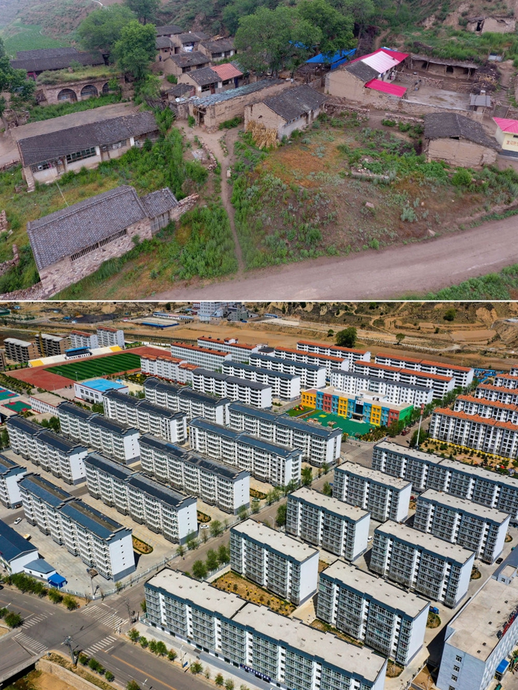 拼版照片:上圖為2017年6月22日拍攝的山西省忻州市岢嵐縣趙家洼村(無人機(jī)照片);下圖為5月20日拍攝的岢嵐縣廣惠園移民新區(qū),部分趙家洼村村民居住在這里(無人機(jī)照片)。新華社記者 曹陽(yáng) 攝