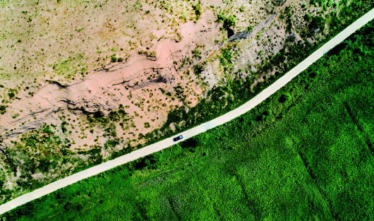 一輛汽車(chē)行駛在榆林市橫山區(qū)沙漠治理與未治理的分界公路上(2018年8月4日無(wú)人機(jī)拍攝)。