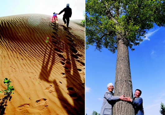 拼版照片左圖:1998年8月,榆林市靖邊縣郭成旺老人帶著曾孫行進(jìn)在沙漠中。老人的希望是:子子孫孫植樹(shù)造林,直到沙漠都變成綠洲;右圖:2020年5月22日,99歲的郭成旺老人(左)與孫兒郭建軍抱著當(dāng)年栽下的第一棵楊樹(shù),向參觀者介紹當(dāng)年植樹(shù)的情景。本報(bào)記者陶明攝