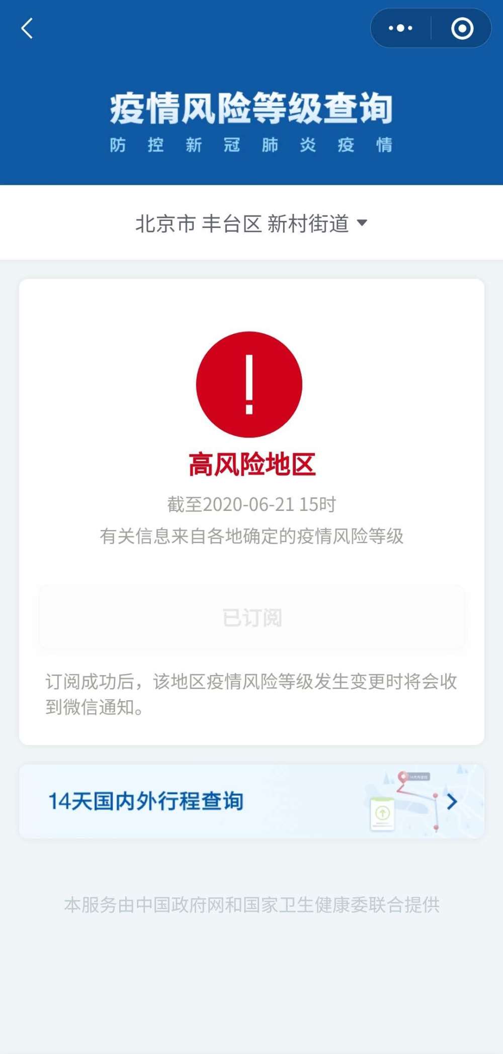 記者從國務(wù)院客戶端小程序“疫情風(fēng)險等級查詢”上了解到,截至6月21日15時,北京市豐臺區(qū)新村街道、大興區(qū)黃村(地區(qū))鎮(zhèn)由中風(fēng)險調(diào)整為高風(fēng)險。北京市豐臺區(qū)長辛店街道、右安門街道,大興區(qū)安定鎮(zhèn),海淀區(qū)八里莊街道,通州區(qū)北苑街道由低風(fēng)險調(diào)整為中風(fēng)險。
