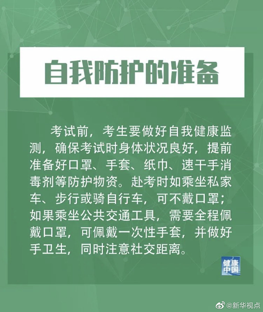 措施提到,低風(fēng)險(xiǎn)地區(qū)的考生在進(jìn)入考場(chǎng)前要佩戴口罩,進(jìn)入考場(chǎng)就座后,可以自主決定是否佩戴;備用隔離考場(chǎng)和中高風(fēng)險(xiǎn)地區(qū)的考生,要全程佩戴口罩。工作人員和監(jiān)考人員全程佩戴口罩,隔離考場(chǎng)的監(jiān)考員及工作人員須穿戴工作服、醫(yī)用防護(hù)口罩和一次性手套等,必要時(shí)可穿戴防護(hù)服。
