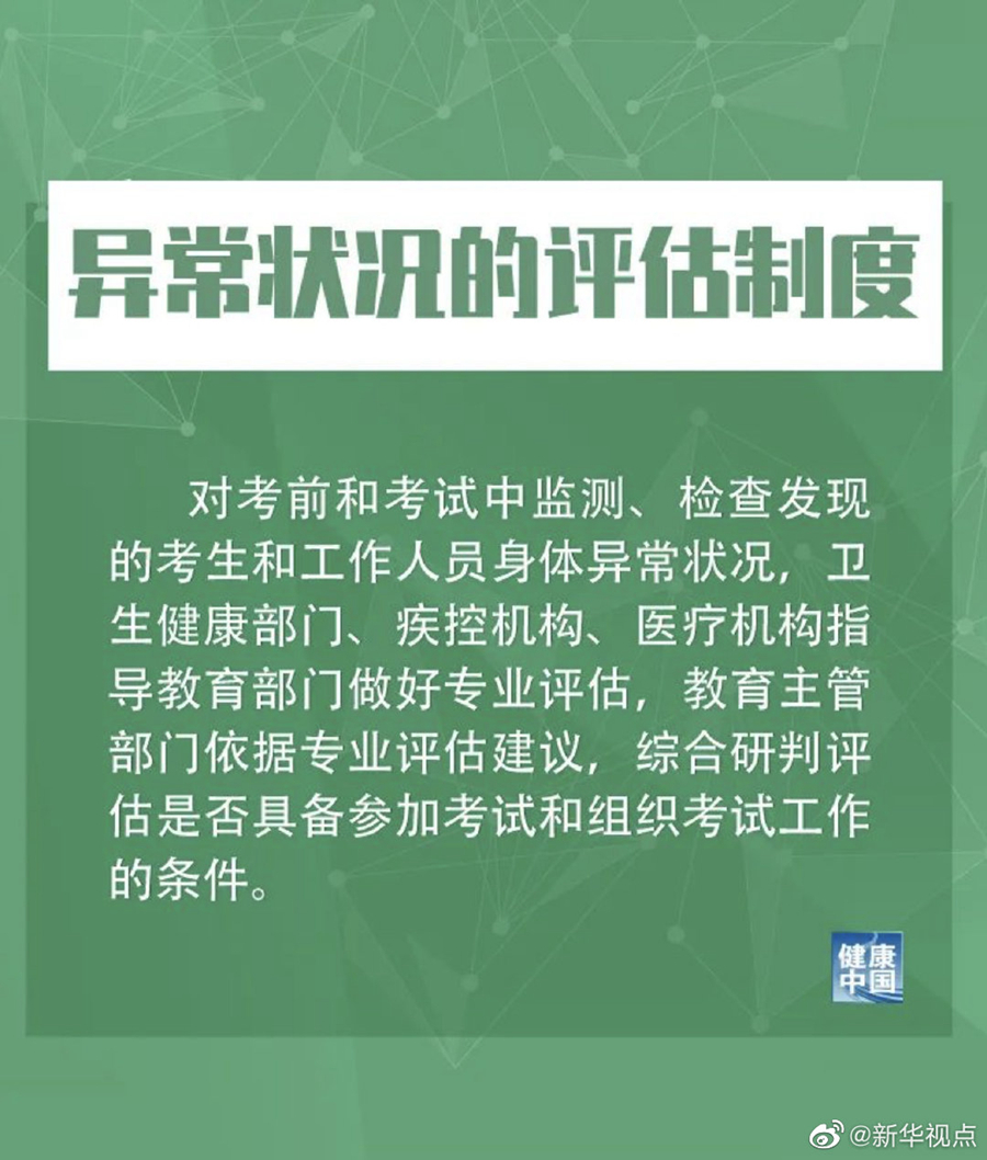 考試過(guò)程中有發(fā)熱、咳嗽等呼吸道癥狀者,措施提到,由考點(diǎn)當(dāng)?shù)氐男l(wèi)生健康部門(mén)、疾控機(jī)構(gòu)和醫(yī)療機(jī)構(gòu)專業(yè)人員進(jìn)行個(gè)案研判,具備繼續(xù)完成考試條件的考生,須安排在備用隔離考場(chǎng)考試。考生從普通考場(chǎng)轉(zhuǎn)移至備用隔離考場(chǎng)(未出考點(diǎn))所耽誤的時(shí)間,經(jīng)省級(jí)招生考試機(jī)構(gòu)批準(zhǔn)予以補(bǔ)齊。當(dāng)科目考試結(jié)束時(shí),由負(fù)責(zé)研判的專業(yè)人員當(dāng)場(chǎng)簡(jiǎn)要向所有考生進(jìn)行解釋和說(shuō)明,避免其他考生恐慌。