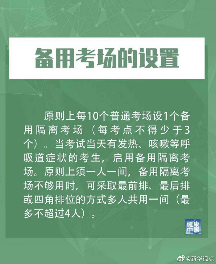 對(duì)于備用考場(chǎng)的設(shè)置,措施提到,原則上每10個(gè)普通考場(chǎng)設(shè)1個(gè)備用隔離考場(chǎng)(每考點(diǎn)不得少于3個(gè))。當(dāng)考試當(dāng)天有發(fā)熱、咳嗽等呼吸道癥狀的考生,啟用備用隔離考場(chǎng)。原則上須一人一間,備用隔離考場(chǎng)不夠用時(shí),可采取最前排、最后排或四角排位的方式多人共用一間(最多不超過(guò)4人)。