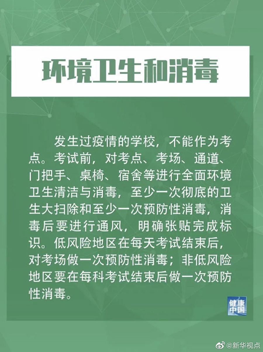 措施提到,發(fā)生過(guò)疫情的學(xué)校,不能作為考點(diǎn)。低風(fēng)險(xiǎn)地區(qū)在每天考試結(jié)束后,對(duì)考場(chǎng)做一次預(yù)防性消毒;非低風(fēng)險(xiǎn)地區(qū)要在每科考試結(jié)束后做一次預(yù)防性消毒。