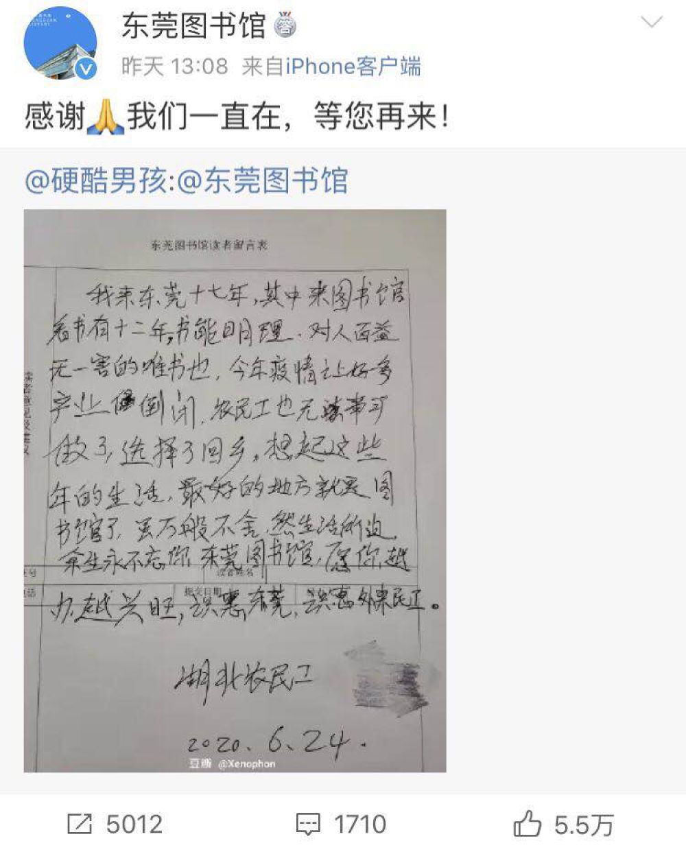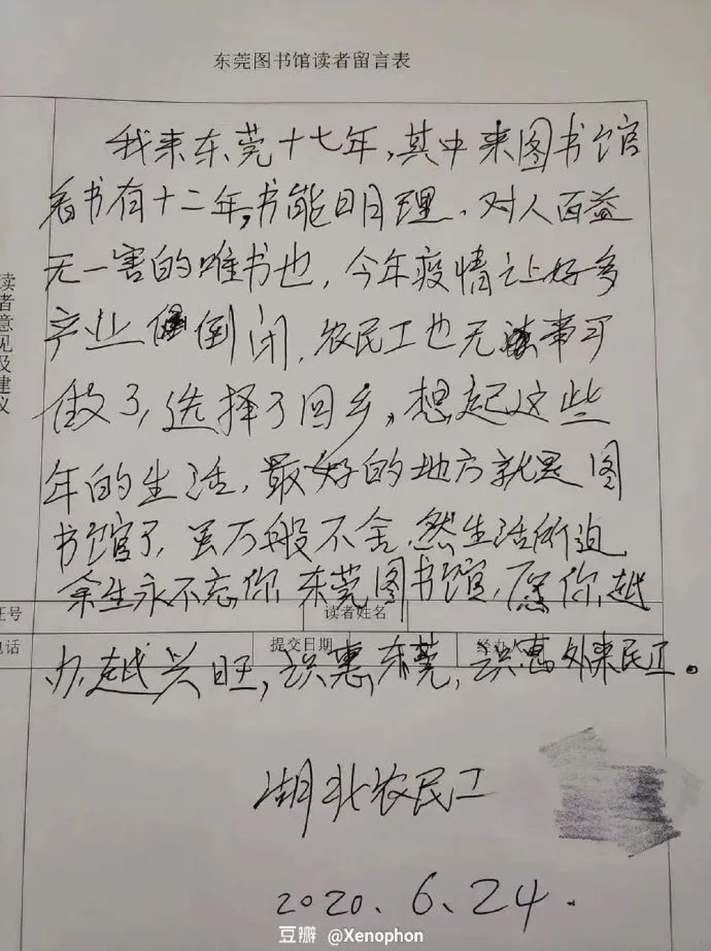 “我來(lái)東莞十七年,其中來(lái)圖書(shū)館看書(shū)有十二年。書(shū)能明理,對(duì)人百益無(wú)一害的唯書(shū)也。今年疫情讓好多產(chǎn)業(yè)(企業(yè))倒閉,農(nóng)民工也無(wú)事可做了,選擇了回鄉(xiāng)。想起這些年的生活,最好的地方就是圖書(shū)館了。雖萬(wàn)般不舍,然生活所迫,余生永不忘你,東莞圖書(shū)館,愿你越辦越興旺。識(shí)惠東莞,識(shí)惠外來(lái)農(nóng)民工?!?/span>