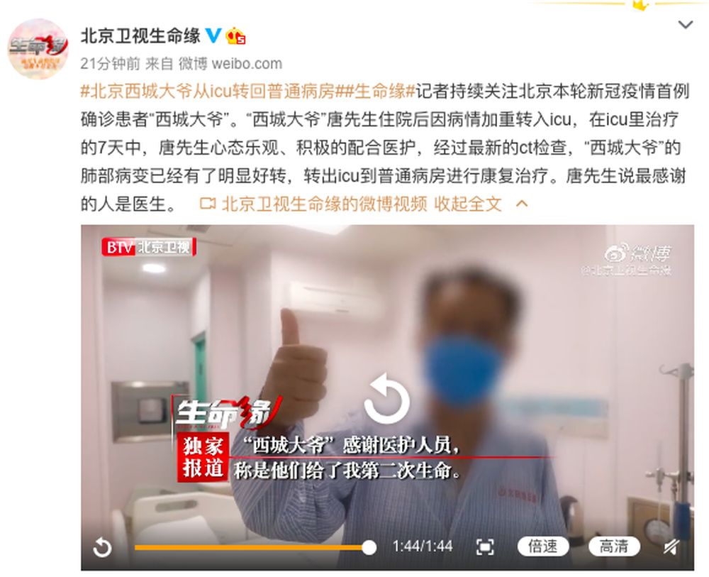 記者持續(xù)關(guān)注北京本輪新冠疫情首例確診患者“西城大爺”。“西城大爺”唐先生住院后因病情加重轉(zhuǎn)入ICU,在ICU治療的7天中,唐先生心態(tài)樂觀、積極配合醫(yī)護(hù),經(jīng)過最新的CT檢查,“西城大爺”的肺部病變已經(jīng)有了明顯好轉(zhuǎn),轉(zhuǎn)出ICU到普通病房進(jìn)行康復(fù)治療。唐先生說最感謝的人是醫(yī)生。