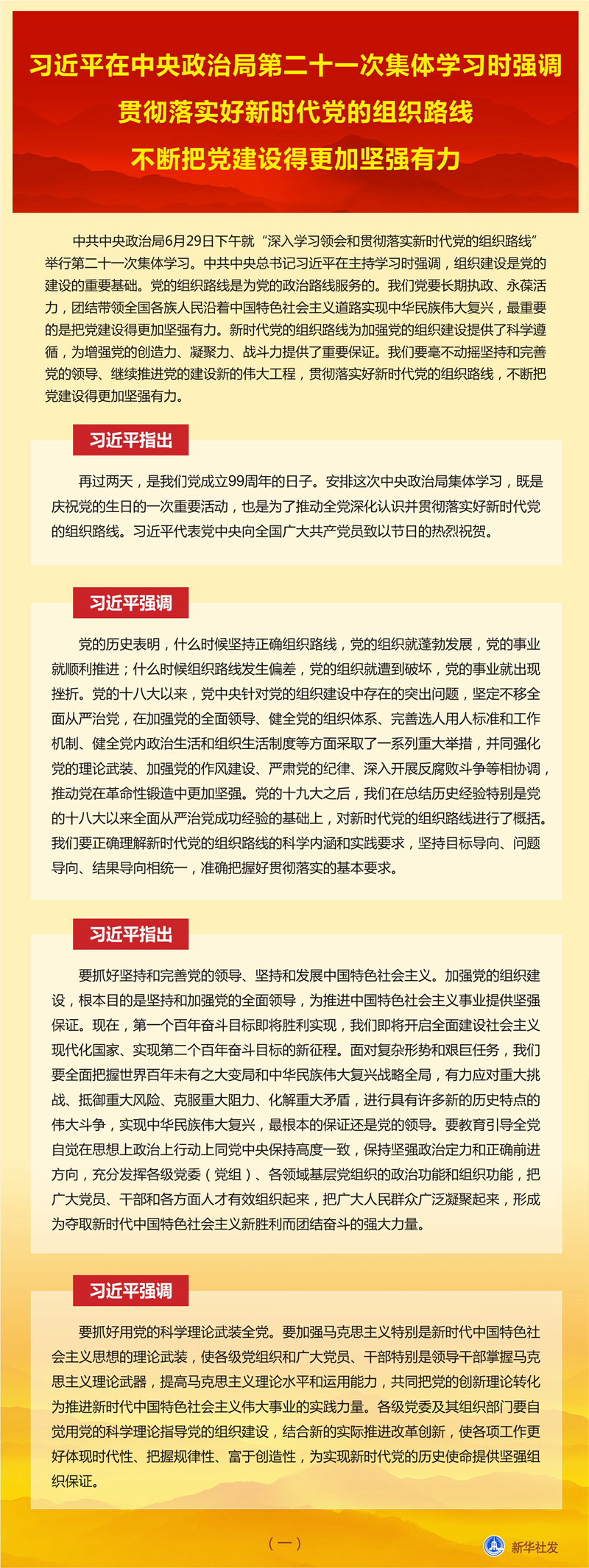 新華社北京6月30日電 中共中央政治局6月29日下午就“深入學(xué)習(xí)領(lǐng)會和貫徹落實新時代黨的組織路線”舉行第二十一次集體學(xué)習(xí)。中共中央總書記習(xí)近平在主持學(xué)習(xí)時強調(diào),組織建設(shè)是黨的建設(shè)的重要基礎(chǔ)。黨的組織路線是為黨的政治路線服務(wù)的。我們黨要長期執(zhí)政、永葆活力,團結(jié)帶領(lǐng)全國各族人民沿著中國特色社會主義道路實現(xiàn)中華民族偉大復(fù)興,最重要的是把黨建設(shè)得更加堅強有力。新時代黨的組織路線為加強黨的組織建設(shè)提供了科學(xué)遵循,為增強黨的創(chuàng)造力、凝聚力、戰(zhàn)斗力提供了重要保證。我們要毫不動搖堅持和完善黨的領(lǐng)導(dǎo)、繼續(xù)推進黨的建設(shè)新的偉大工程,貫徹落實好新時代黨的組織路線,不斷把黨建設(shè)得更加堅強有力。