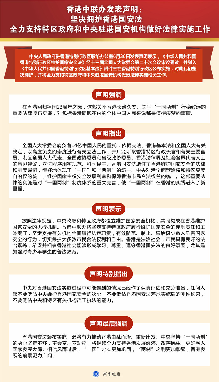 新華社香港6月30日電? 中央人民政府駐香港特別行政區(qū)聯(lián)絡(luò)辦公室30日發(fā)表聲明表示,《中華人民共和國香港特別行政區(qū)維護(hù)國家安全法》經(jīng)十三屆全國人大常委會(huì)第二十次會(huì)議審議通過,并列入《中華人民共和國香港特別行政區(qū)基本法》附件三在香港特別行政區(qū)公布實(shí)施,對(duì)此我們堅(jiān)決擁護(hù),并將全力支持特區(qū)政府和中央駐港國安機(jī)構(gòu)做好法律實(shí)施相關(guān)工作。
