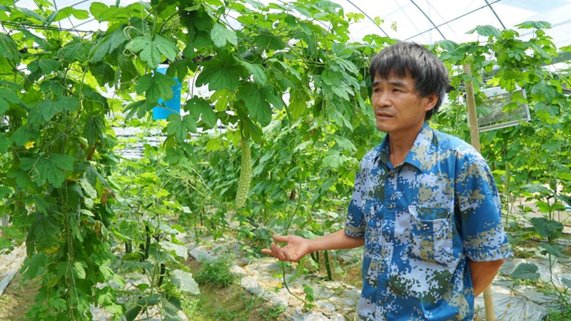 沿著寬敞的瀝青馬路進(jìn)入禾豐鎮(zhèn)陂角村,首先映入眼簾的是田間地頭一座座現(xiàn)代化的蔬菜大棚。在一個(gè)10畝的蔬菜大棚里,貧困戶謝來(lái)龍正帶著2位村民在自家地里忙著摘苦瓜。