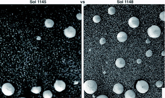 在巖層頂部的這些“生命”是集體定向的,帽子和莖向上傾斜,像沖著某個光源進(jìn)行光合作用。此外,“機(jī)遇號”還拍到了在無風(fēng)情況下,12個球形“生命”冒出土壤,另外11個“生命”在三天內(nèi)明顯長大的照片。