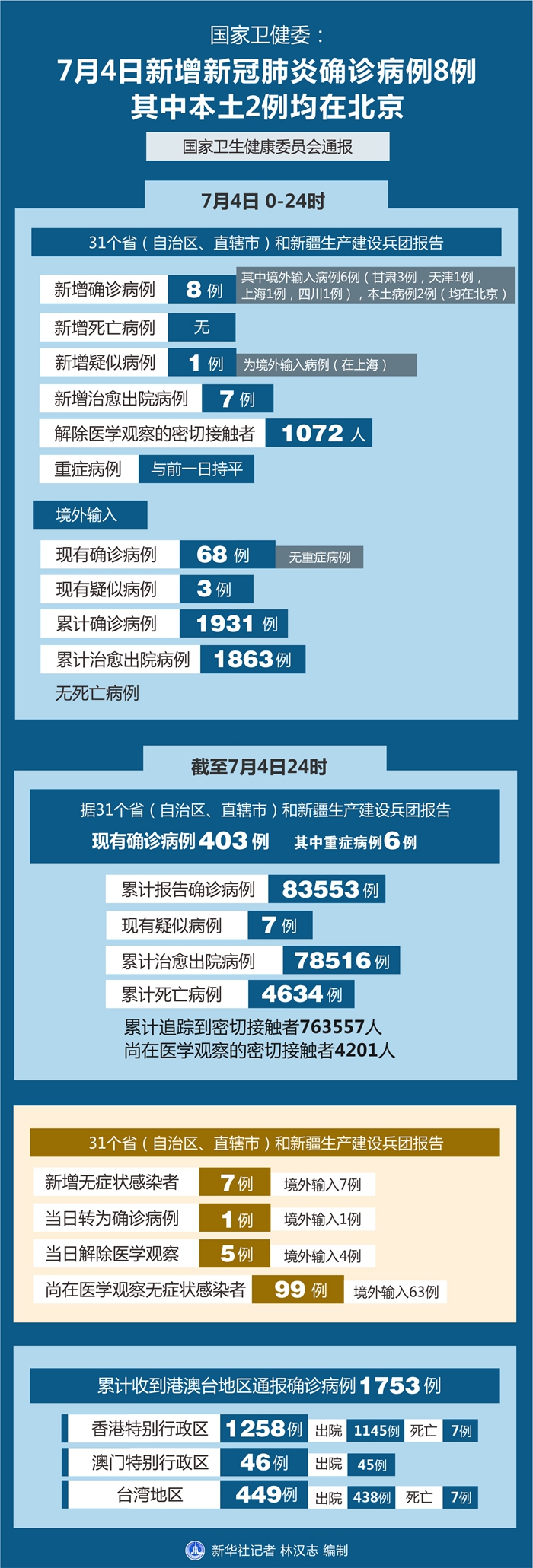 截至7月4日24時,據(jù)31個?。ㄗ灾螀^(qū)、直轄市)和新疆生產(chǎn)建設(shè)兵團(tuán)報告,現(xiàn)有確診病例403例(其中重癥病例6例),累計(jì)治愈出院病例78516例,累計(jì)死亡病例4634例,累計(jì)報告確診病例83553例,現(xiàn)有疑似病例7例。累計(jì)追蹤到密切接觸者763557人,尚在醫(yī)學(xué)觀察的密切接觸者4201人。