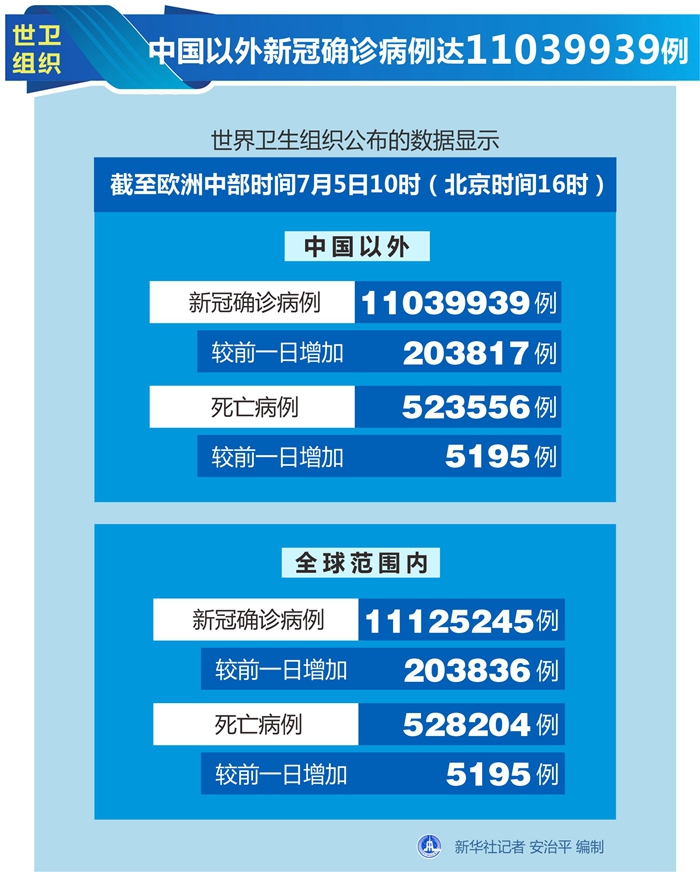 世衛(wèi)組織每日疫情報告顯示,截至歐洲中部時間5日10時(北京時間16時),中國以外新冠確診病例較前一日增加203817例,達到11039939例;中國以外死亡病例較前一日增加5195例,達到523556例。
