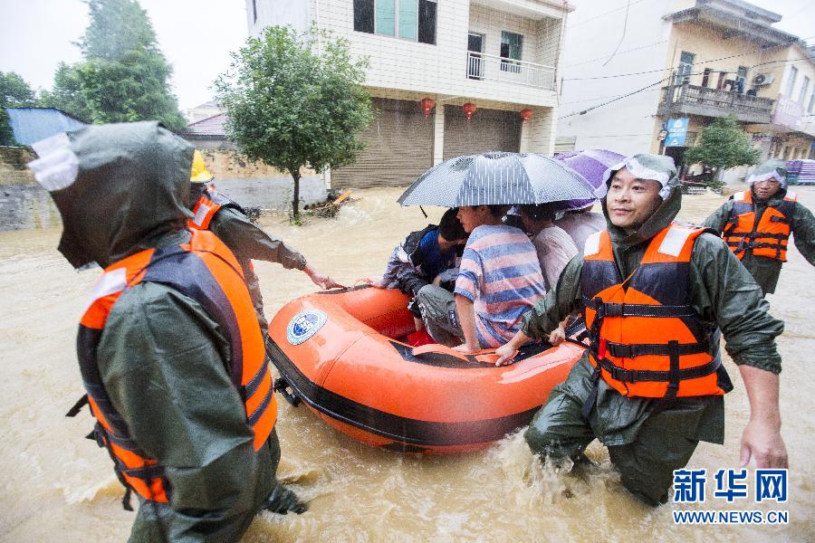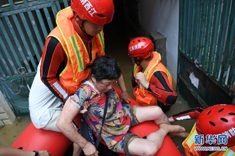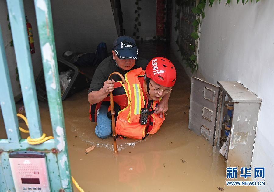7月8日,在景德鎮(zhèn)市金悅小區(qū),救援人員轉(zhuǎn)移受困群眾。 新華社記者 萬象 攝