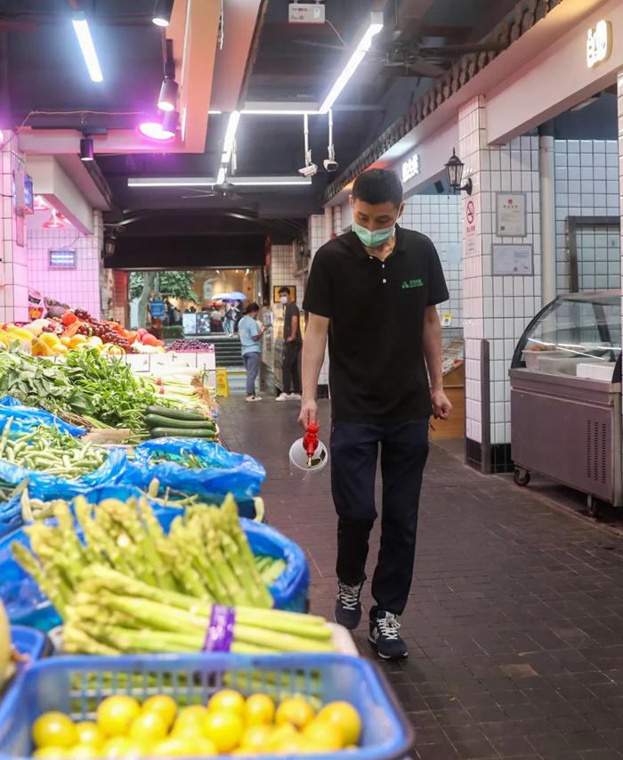6月16日,在上海市一家菜場(chǎng)內(nèi),工作人員在進(jìn)行消毒工作 丁汀 攝