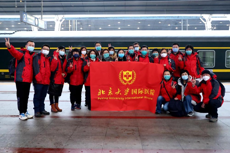 北京大學(xué)國際醫(yī)院醫(yī)療隊隊員在北京西站合影,準(zhǔn)備乘坐火車馳援湖北抗疫(2月6日攝)。新華社記者張玉薇攝