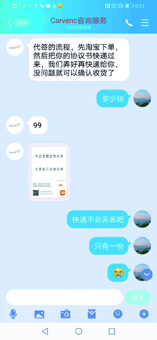 淘寶網(wǎng)上有多家能代簽三方協(xié)議的商家。在看到記者“能否代蓋三方協(xié)議公章”的留言后,一家名為“carvenc education”的商家立即追問所在學校、專業(yè)。記者提供相關(guān)信息后,不到一分鐘,商家就發(fā)來相匹配的公司名稱和崗位,“只要99元,協(xié)議書真實有效,包回訪?!?/p>