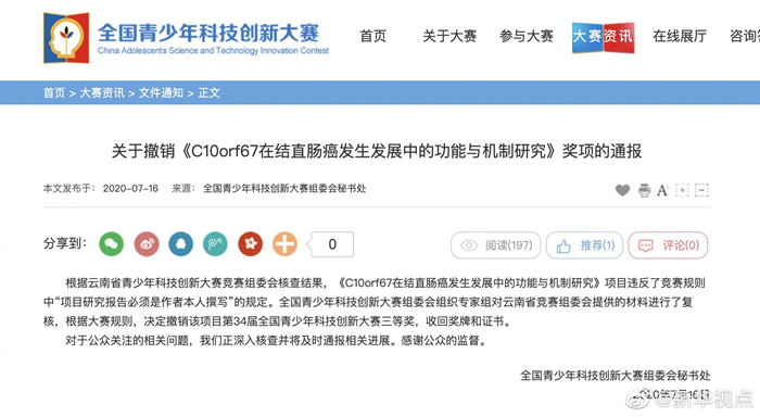 全國青少年科技創(chuàng)新大賽組委會16日發(fā)布通報,根據(jù)云南省青少年科技創(chuàng)新大賽競賽組委會核查結(jié)果,《C10orf67在結(jié)直腸癌發(fā)生發(fā)展中的功能與機(jī)制研究》項目違反了競賽規(guī)則中“項目研究報告必須是作者本人撰寫”的規(guī)定。全國青少年科技創(chuàng)新大賽組委會組織專家組對云南省競賽組委會提供的材料進(jìn)行了復(fù)核,根據(jù)大賽規(guī)則,決定撤銷該項目第34屆全國青少年科技創(chuàng)新大賽三等獎,收回獎牌和證書。對于公眾關(guān)注的相關(guān)問題,正深入核查并將及時通報相關(guān)進(jìn)展。