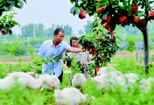 6月11日,李?。ㄗ螅┰谕┌乜h埠江鎮(zhèn)付樓村黃金梨種植基地查看黃金梨套袋情況。本報(bào)記者郝源攝