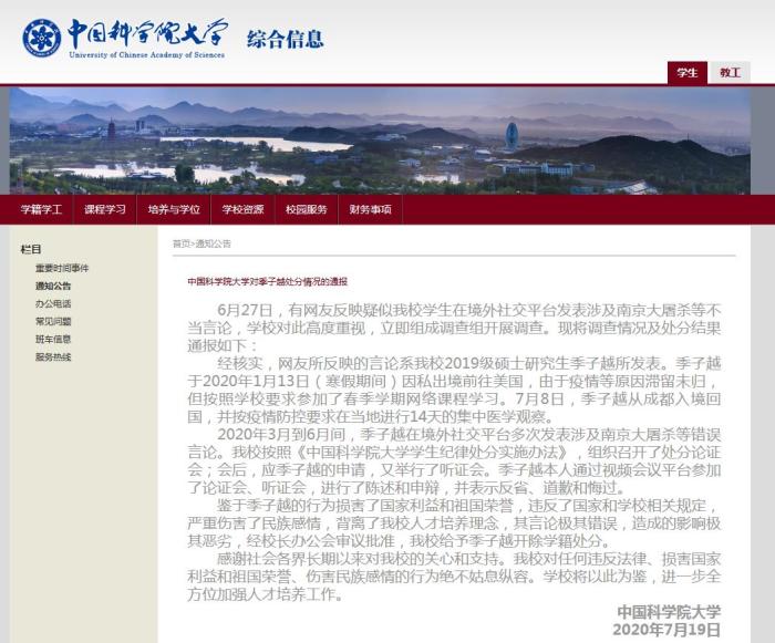 2020年3月到6月間,季子越在境外社交平臺(tái)多次發(fā)表涉及南京大屠殺等錯(cuò)誤言論。中國(guó)科學(xué)院大學(xué)按照《中國(guó)科學(xué)院大學(xué)學(xué)生紀(jì)律處分實(shí)施辦法》,組織召開(kāi)了處分論證會(huì);會(huì)后,應(yīng)季子越的申請(qǐng),又舉行了聽(tīng)證會(huì)。季子越本人通過(guò)視頻會(huì)議平臺(tái)參加了論證會(huì)、聽(tīng)證會(huì),進(jìn)行了陳述和申辯,并表示反省、道歉和悔過(guò)。