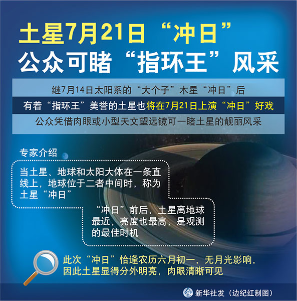 新華社天津7月19日電(記者周潤(rùn)?。├^7月14日太陽系的“大個(gè)子”木星“沖日”后,有著“指環(huán)王”美譽(yù)的土星也將在7月21日上演“沖日”好戲,公眾憑借肉眼或小型天文望遠(yuǎn)鏡可一睹土星的靚麗風(fēng)采。