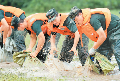 7月11日,武警江西總隊機動支隊官兵在鄱陽縣江家?guī)X村昌江圩堤傳遞沙袋,封堵管涌。曹先訓攝(人民視覺)