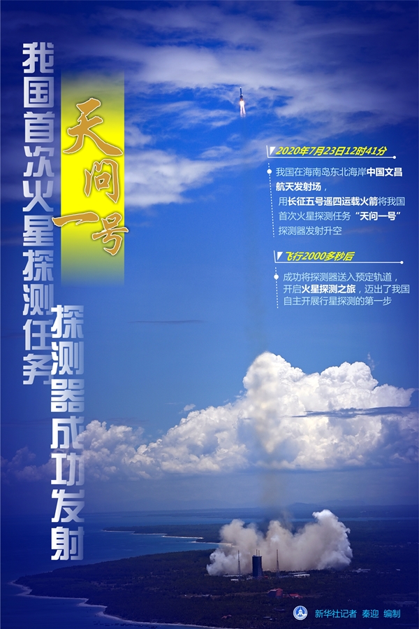 2020年7月23日12時41分,我國在海南島東北海岸中國文昌航天發(fā)射場,用長征五號遙四運載火箭將我國首次火星探測任務“天問一號”探測器發(fā)射升空,飛行2000多秒后,成功將探測器送入預定軌道,開啟火星探測之旅,邁出了我國自主開展行星探測的第一步。新華社記者 胡喆 攝